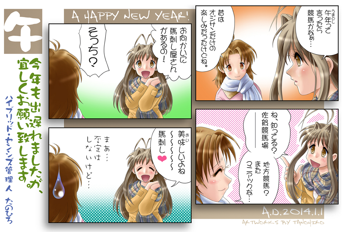 2014年! CG・WEBコミ 2014年01月24日 滅多に更新していないので、1ページに過去の年賀絵と最新の年賀絵が同時に表示されていると何かフクザツな気持ちになりますネ・・・(汗)今年は去年よりも3日ほど年賀絵完成時期が遅れてしまいました。・・・まあ、どちらもかなり遅い完成だったので、どうでもいいことではありますが。PR